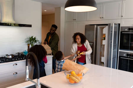 Happy african american siblings unpacking groceries with parents in kitchen. family time, having fun together at home.