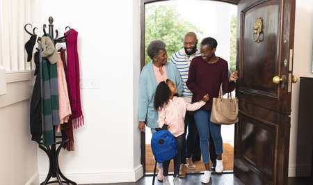 Image of happy multi generation african american family entering house. Extended family, spending quality time together concept.