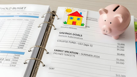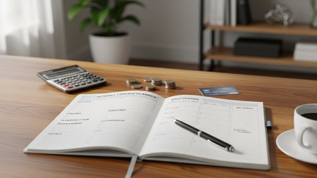 Blank notebook, with monthly budget and calculations, and card with help text. Rising living expenses, and inflation.