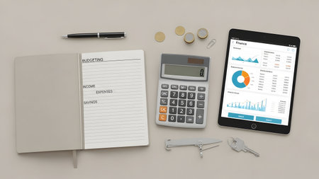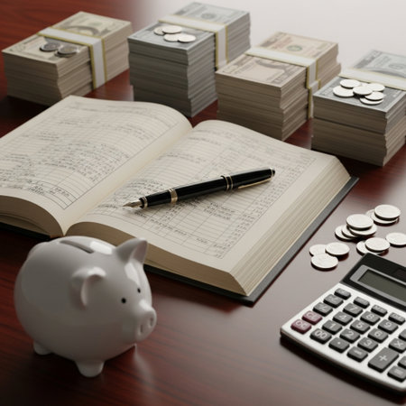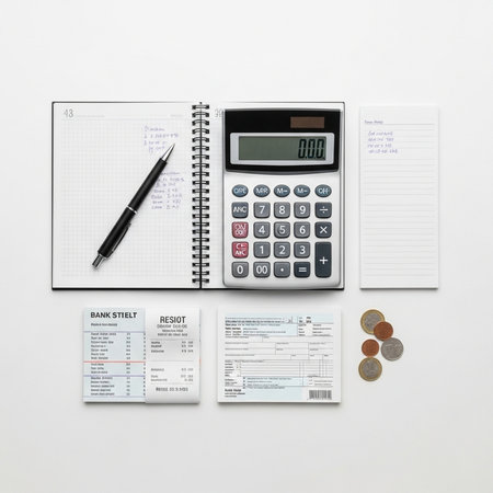 Calculator, bank ledger, and stack of financial documents on clean business table