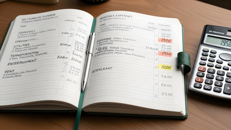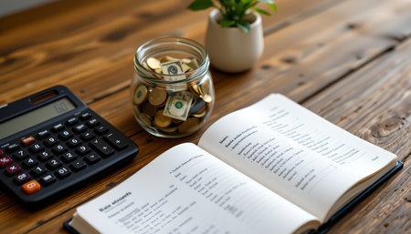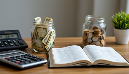 money and calculator calculating personal finance and saving money money in jar and household accounts book on wood table money,calculating machine,jar,book,note,save,saving,finance,personal,household,account,budget,family,economy,expenditure,spending,expense,cash,coin,desk,table,wood,light,copy space,concept,nobody,no people, space for text, c 20 s 188 p 495whra, Generative AI