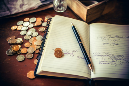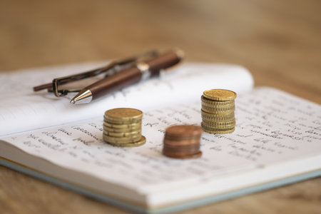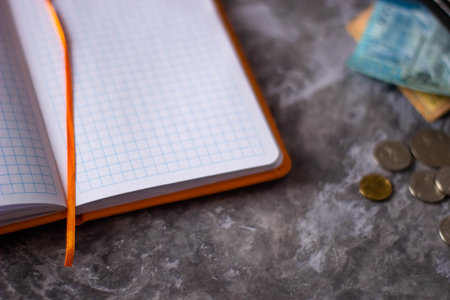 Notebook, coins and moneyle table. Selective focus.