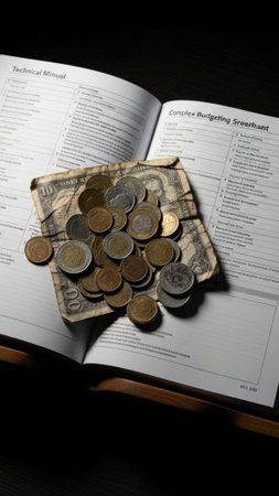 Cash and coins are spread out around an open notebook filled with financial calculations and budgeting notes.