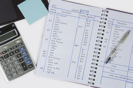A calculator and an open, two column cash book with pen on a wooden desk. Copy space is provided via empty leger (ledger) lines. Horizontal (landscape) orientation.