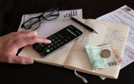 Objects used when paying bills or carrying household finances. Money, calculator, pencil and bills on a notebook. Doing calculations.