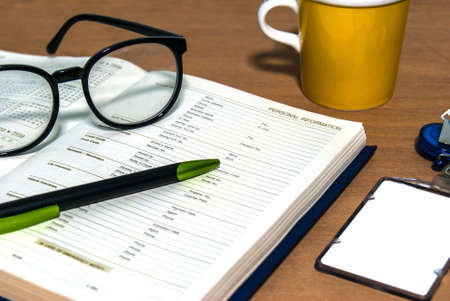 close up office desk with open book information page and stationery