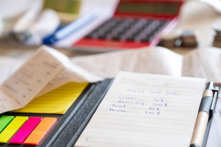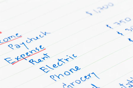 Monthly expenses are written on piece of paper with calculator. Family budget planning concept
