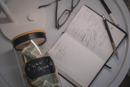 A jar of money sits on a table next to a notebook. New home concept.