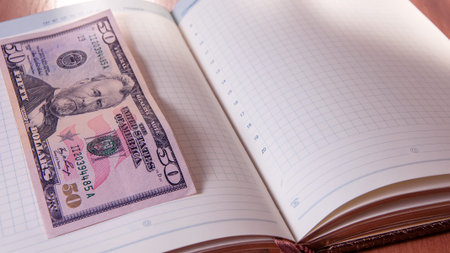 Fifty American dollars and Notepad on wooden table. Fifty American dollars and Notepad