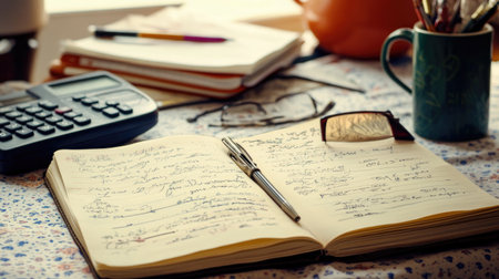 Notebook with handwritten study notes, next to pencil case and calculator on a bright tabletop