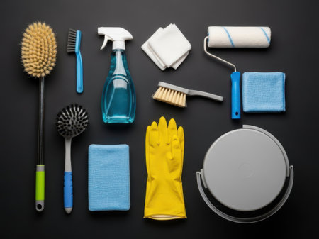 This image showcases a variety of cleaning supplies and tools arranged neatly on a white background. The assortment includes brushes, cleaning solutions, rags, gloves, and a paint roller, all essential for different cleaning tasks. The white background highlights the items, making it clear and visually appealing.