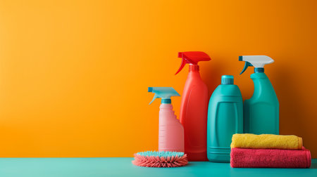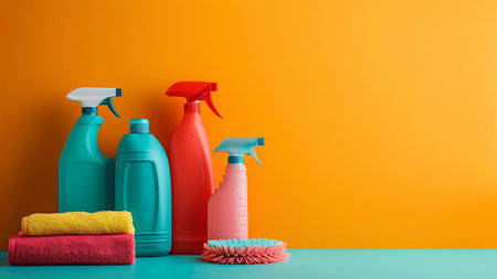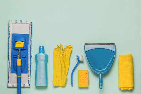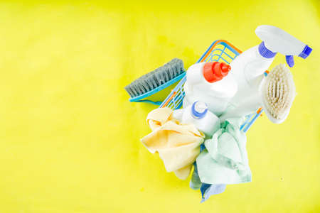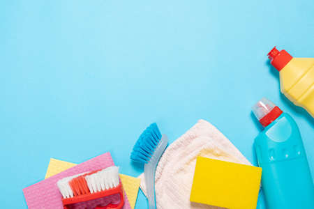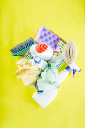 various cleaning products for the house on a colored background. blank space can be used for your text