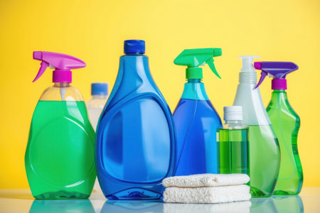 House cleaning detergent bottles on a yellow background