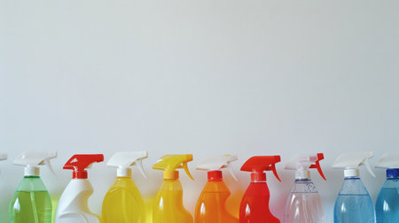 Colorful cleaning spray bottles in a row against white background. ai generated