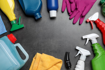Cleaning products on stone gray background. Home cleaning concept. Top view