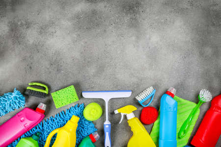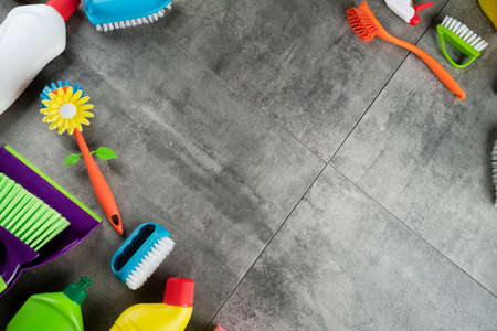 Autumn cleaning. Colorful set of bottles with clining liquids and colorful cleaning kit on gray tiles.