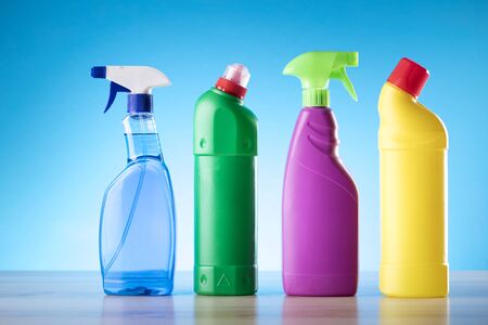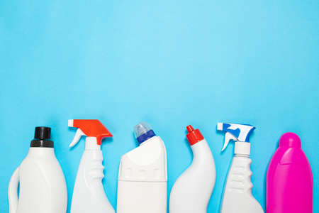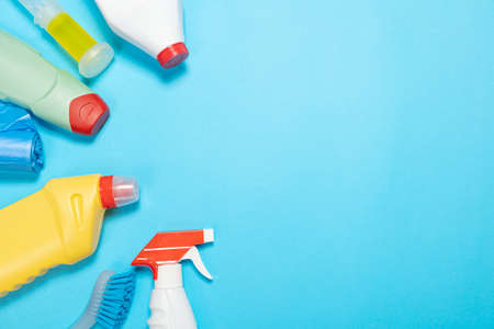 colored bottles of cleaning agent on a blue background on the side. Professional cleaning products, general cleaning. Household chemicals top view