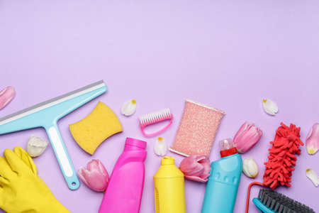 Set of cleaning supplies and spring flowers on color background