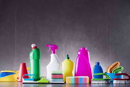 Various detergents and cleaning products agent, gray background