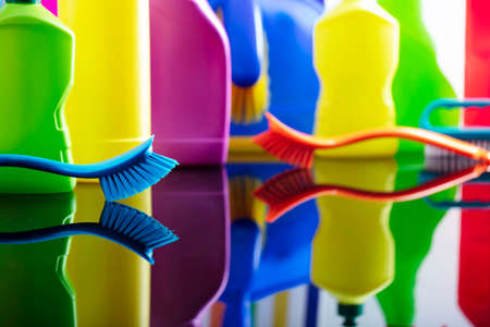 Cleaning products, plastic bottles. Household cleaning, hygiene, and sanitation concept. Isolated or grouped.