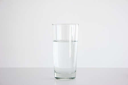 Clear glass three quarters full of water set on white table isolated close up frontal shot 2020