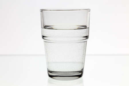 Close-up of half full glass with clear sparkling water on white background.Healthcare and beauty concept