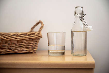 Glass bottle and a drinking glass with water on woodent table, indoor. Drinking water, healthy lifestyle