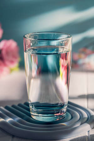 Glass with water on a white background. The play of shadow and light. Summer white background. High quality photo