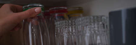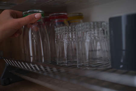 Woman hand pulls out glass cup from cabinet in kitchen