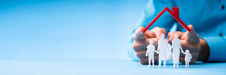Insurer protecting a family, a house and a car with his hands; panoramic banner