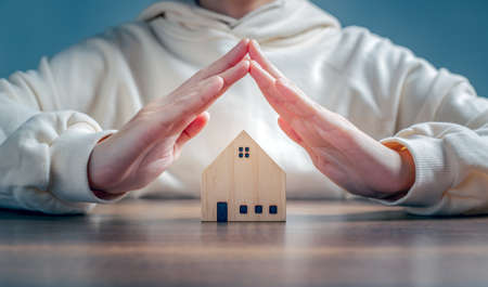Person puts her hand on top of a miniature house model, photo of home insurance concept, when buying a new home should have home insurance to be sure if there is any danger to the home.