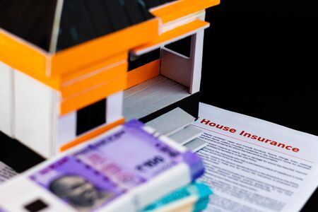 High angle close up of House insurance papers under a model house and blurred money bundles