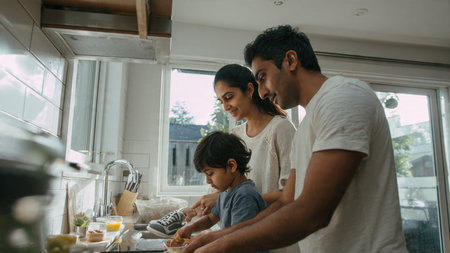 A heartwarming scene of a man, woman, and child standing together in a sleek kitchen, preparing food and enjoying quality time as a family, with a window in the background.