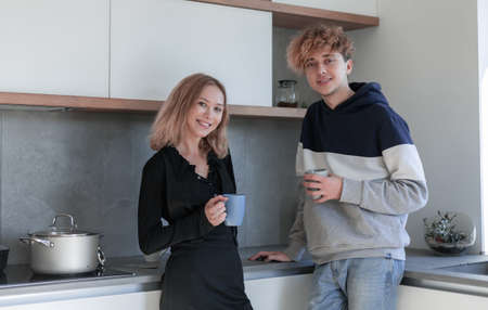 young mom and son look at each other. Happy family in the morning. Beautiful woman with her son having breakfast in kitchen together, son looking at mother and smiling