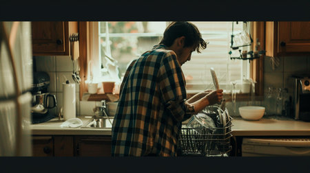 White man washing dishes and talking with his her girlfriend in kitchen at home