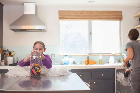 Sorting father and daughter placing recyclables on home kitchen counter, with green recycling bin. Family, sustainability, eco-friendly, homemaking, domestic, environmental, lifestyle