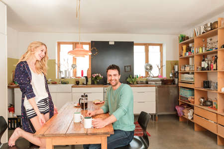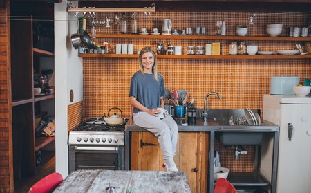 Portrait of an attractive young blonde woman drinking a cup of coffee while sitting on the kitchen counter in the morning
