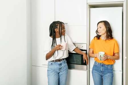 Portrait of young cheerful couple guy and girl standing at home in the kitchen in the apartment and hugging something discussing.