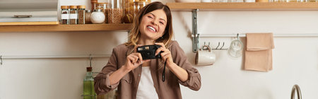 A young beautiful woman smiles while taking a picture in her sunny kitchen, enjoying summer vibes.