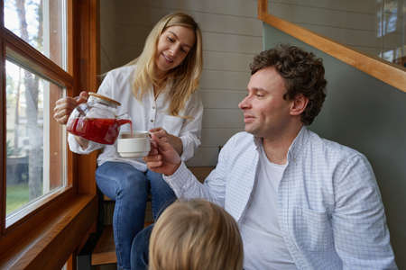 Happy Caucasian family talking to each other during breakfast together at home. father mother talk to their children at mealtime. Family relationship concept