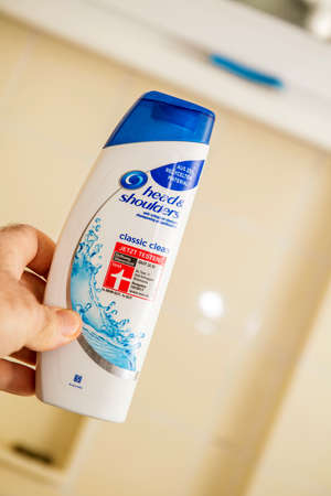 Paris, France - Apr 8, 2020: Male hand holding a plastic package of Head and Shoulders shampoo in the bathroom