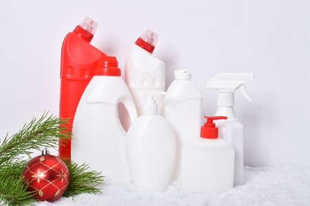 A bottle of household chemicals is standing on the snow next to a Christmas tree branch with a red ball.