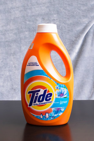 BELARUS, MINSK - 22 MARCH, 2021: Tide liquid detergent on a wooden table close up