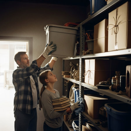 Father helping his daughter to put a bucket on the shelf at home