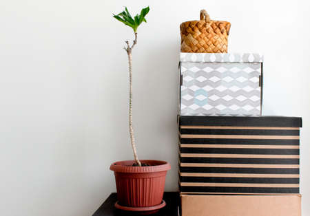 a bast-basket against a white wall. next is a flower pot