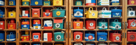 Colorful collection of vintage metal lunchboxes on wooden shelves.