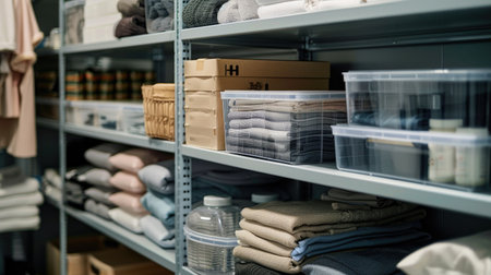 A clean storage room featuring shelves with folded clothes and labeled containers, reflecting meticulous organization.