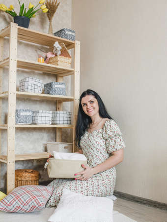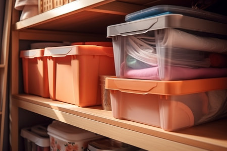 Organization of home space and comfort, plastic boxes containers baskets for wardrobe closets on the shelf, household goods for storing things.