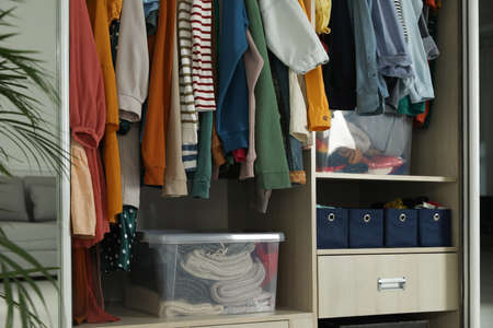 Wardrobe closet with different stylish clothes and home stuff in the room. fast fashion