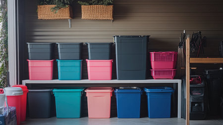 A group of plastic storage bins organized in a garage, showing their role in keeping spaces tidy and clutter-free.